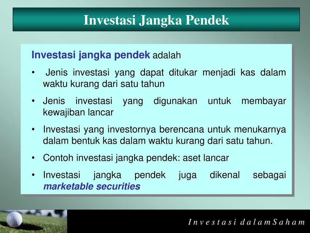 2. Investasi Jangka Pendek: Ini adalah investasi yang diharapkan dapat dicairkan dalam waktu satu tahun, seperti surat berharga pasar uang, obligasi pemerintah jangka pendek, dan deposito berjangka.